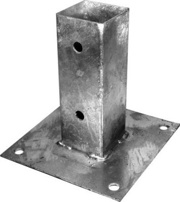 Μία σταθερή αγκυροβολία στήριξης στύλου με κεντρική λεπίδα για τοποθέτηση σε σκυρόδεμα.Μια τρύπα κόβεται στη βάση του ξύλινου πόστ για να χωρέσει πάνω από το στήριγμα του πόστ δίνοντας ένα καθαρό φινίρισμα με μόνο τα μπουλόνια που δείχνουν.